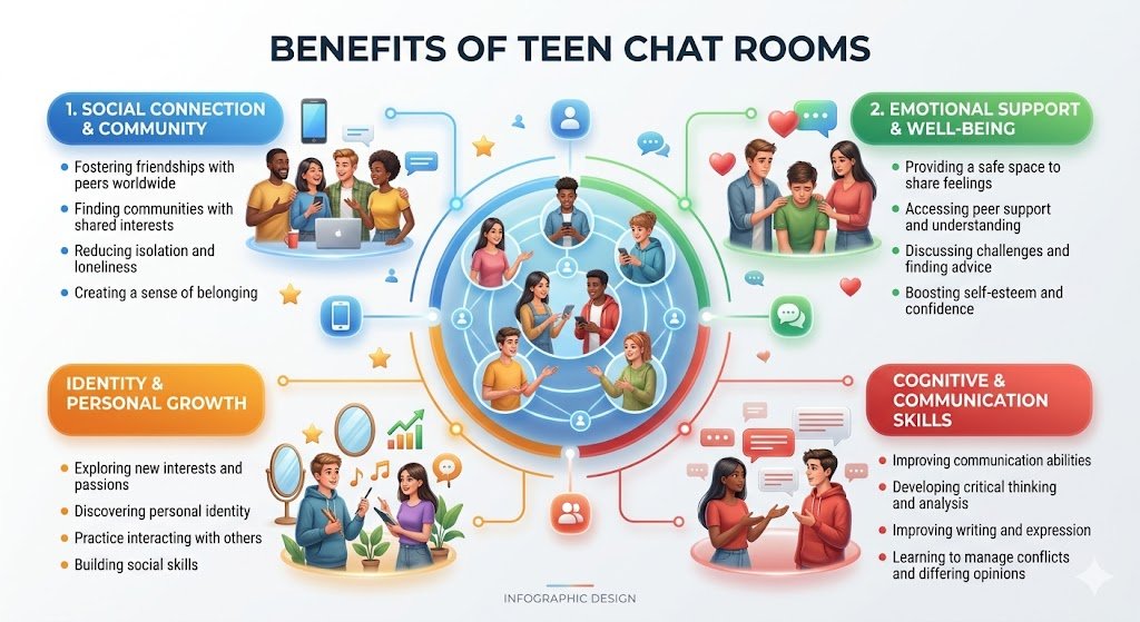 Teen chat rooms provide several benefits, including making new friends, improving communication skills, finding emotional support, learning from peers, and accessing resources that can help with school, hobbies, or personal development.