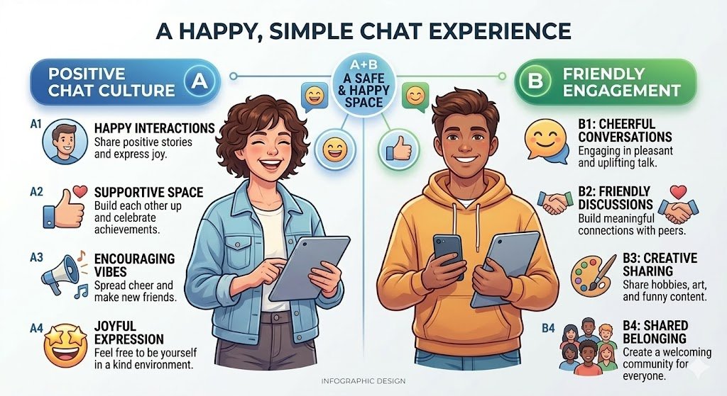 No downloads. No registration. No fees. No personal data required. Just choose a nickname, pick a room, and start chatting with thousands of teens from over 100 countries in real time. Our platform was built from the ground up with one goal: giving every teenager a safe, welcoming, and genuinely fun place to connect.
